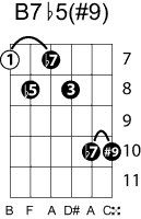 | Symbol: B7♭5(#9) Alt. symbol: B7-5(+9), Bdom7♭5(#9) Name: B dominant seventh, flat fifth, sharp ninth | ![]() | C-2 | G-7 | E-7 | E-7 |