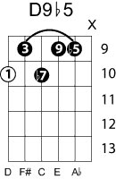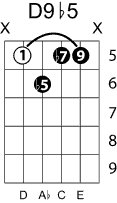 | Symbol: D9♭5 Alt. symbol: D9-5, Ddom9♭5 Name: D ninth, flat fifth | ![]() | D-0 | C-5 | A-5 | G-10 |