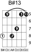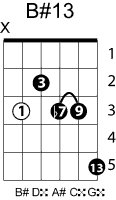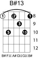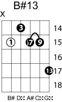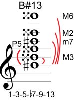| Symbol: B#13 Alt. symbol: B#dom13 Name: B sharp thirteenth | ![]() | A-3 | G-8 | E-8 | A-15 |