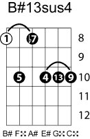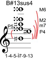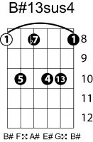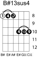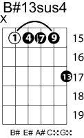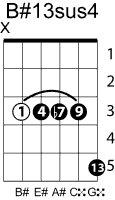| Symbol: B#13sus4 Alt. symbol: B#13sus Name: B sharp thirteenth, suspended fourth | ![]() | A-3 | E-8 | E-8 | E-8 |