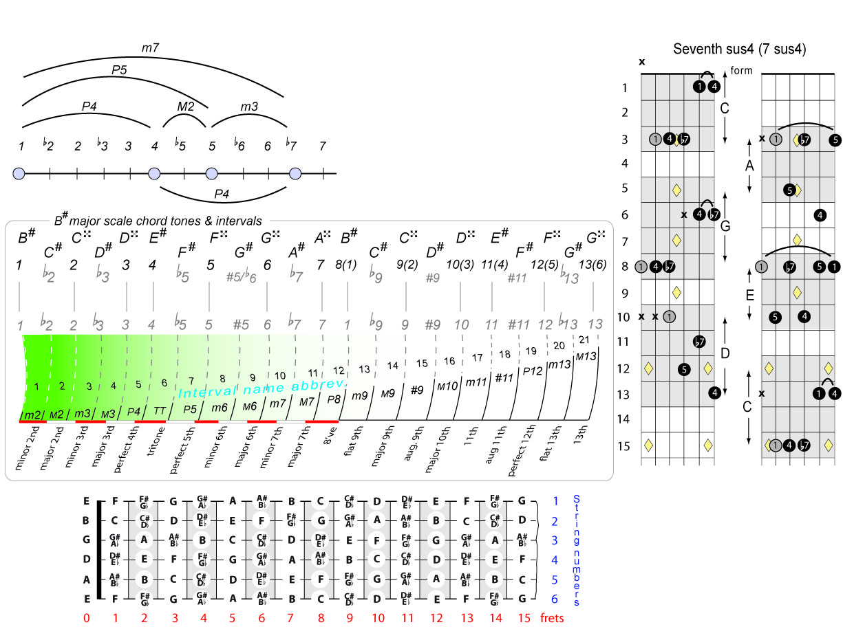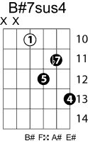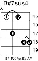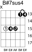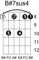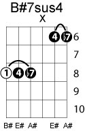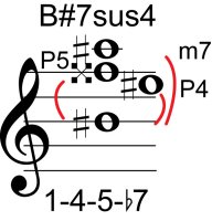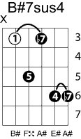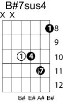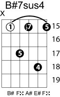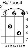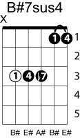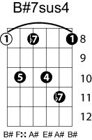 | Symbol: B#7sus4 Alt. symbol: B#7sus Name: B sharp dominant seventh, suspended fourth | ![]() | C-3 | A-3 | A-3 | G-8 | |