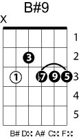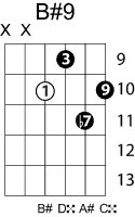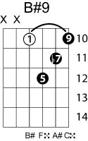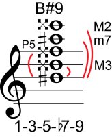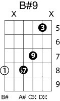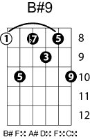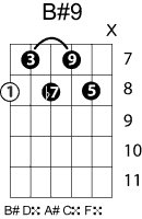 | Symbol: B#9 Alt. symbol: B#7-5, B#dom7♭5 Name: B sharp ninth | ![]() | C-3 | G-8 | G-8 | E-8 |