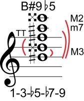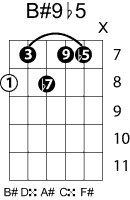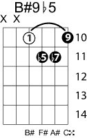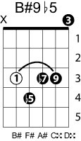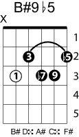 | Symbol: B#9♭5 Alt. symbol: B#9-5, B#dom9♭5 Name: B sharp ninth, flat fifth | ![]() | C-3 | A-3 | G-8 | D-10 |