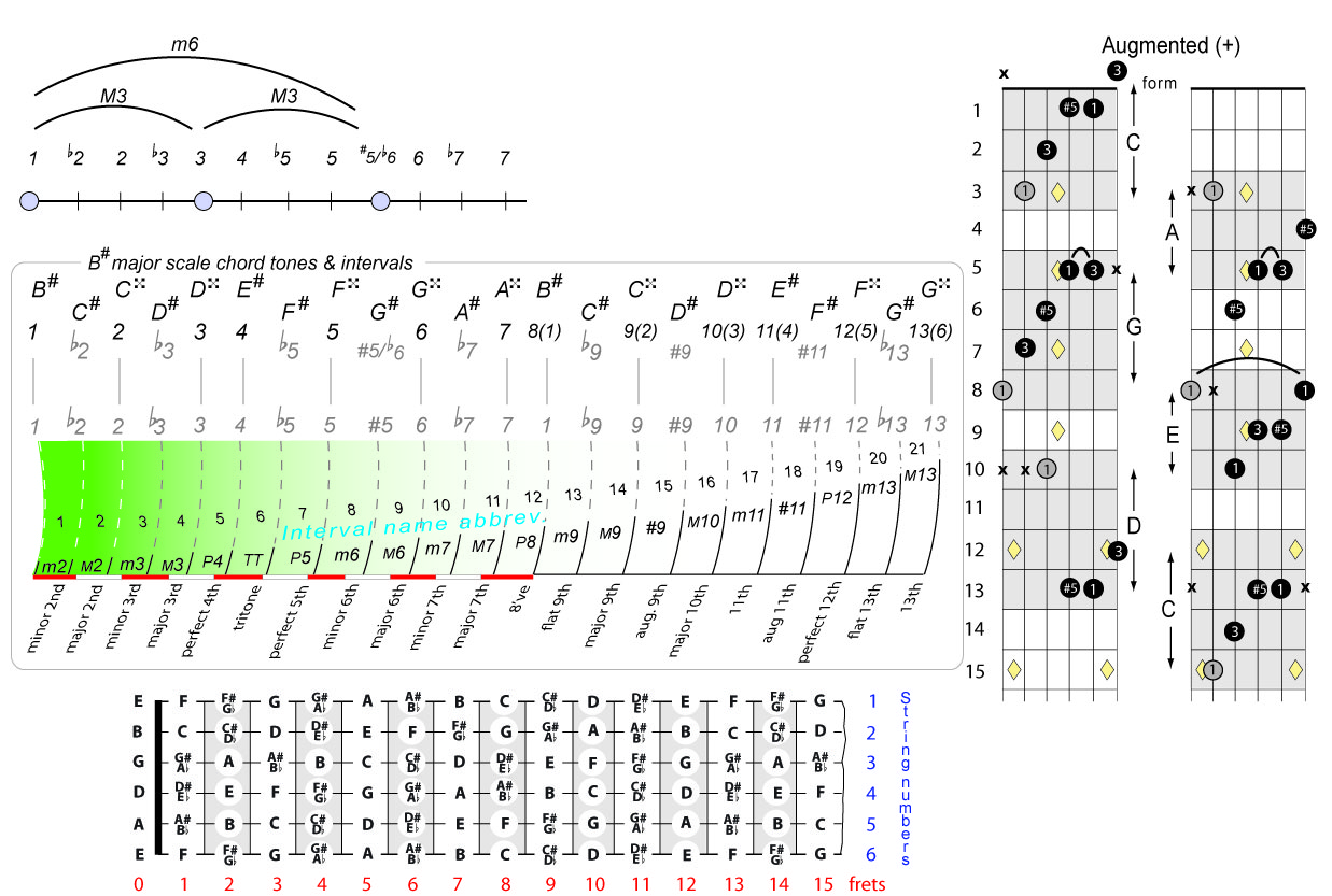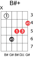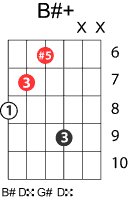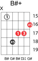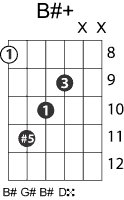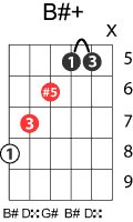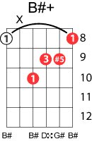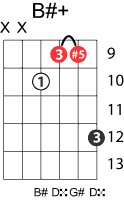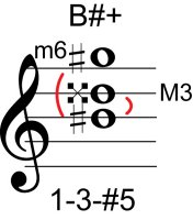 | Symbol: B#+ Alt. symbol: B#aug, B#(#5) Name: B sharp augmented | ![]() | C-3 | A-3 | G-8 | G-8 |