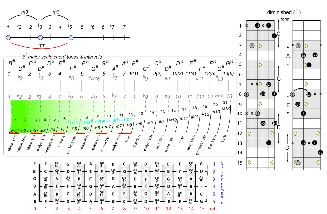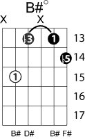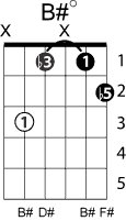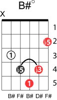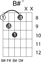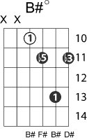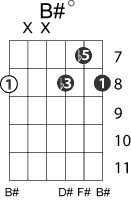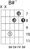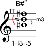 | Symbol: B#° Alt. symbol: B#° Name: B sharp diminished | ![]() | C-3 | A-3 | E-10 | G-8 |