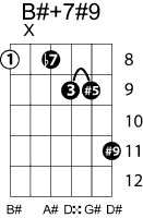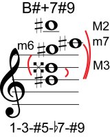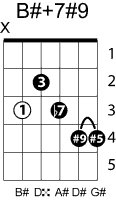 | Symbol: B#+7#9 Alt. symbol: B#7+5(#9) Name: B sharp dominant seventh, sharp fifth, sharp ninth | ![]() | A-3 | E-8 |