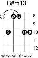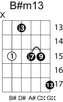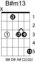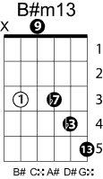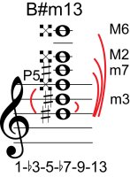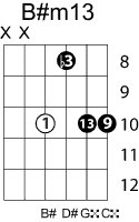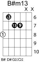 | Symbol: B#m13 Alt. symbol: B#-13, B#min13 Name: B sharp minor thirteenth | ![]() | C-3 | A-3 | E-8 | E-8 |