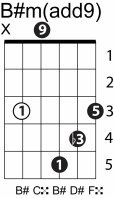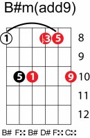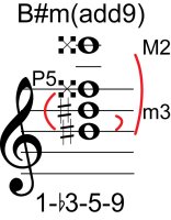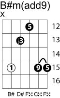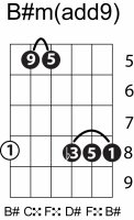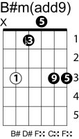 | Symbol: B#m(add9) Alt. symbol: Name: B sharp minor, added ninth | ![]() | C-3 | A-3 | G-8 | E-8 |