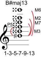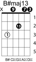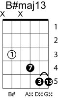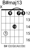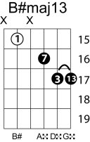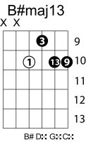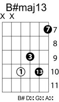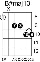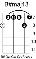 | Symbol: B#maj13 Alt. symbol: B#M13 Name: B sharp major thirteen | ![]() | C-3 | A-3 | G-8 | E-10 |