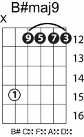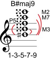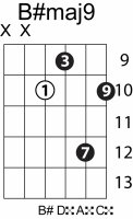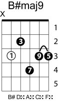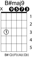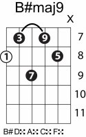 | Symbol: B#maj9 Alt. symbol: B#M9 Name: B sharp major ninth | ![]() | C-3 | A-3 | G-8 | D-10 |