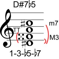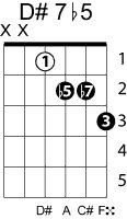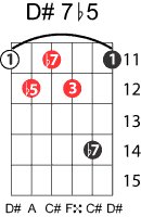 | Symbol: D#7♭5 Alt. symbol: D#7-5, D#dom7♭5 Name: D sharp dominant seventh, flat fifth | ![]() | D-1 | A-6 | G-11 | E-11 |