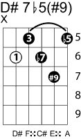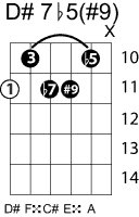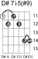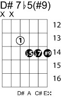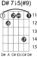 | Symbol: D#7♭5(#9) Alt. symbol: D#7-5(+9), D#dom7♭5(#9) Name: D sharp dominant seventh, flat fifth, sharp ninth | ![]() | A-6 | G-11 | E-11 | E-11 |