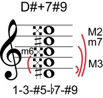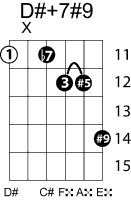 | Symbol: D#+7#9 Alt. symbol: D#7+5(#9) Name: D sharp dominant seventh, sharp fifth, sharp ninth | ![]() | A-6 | E-11 |