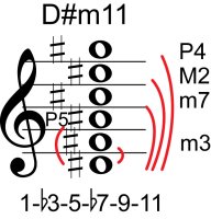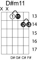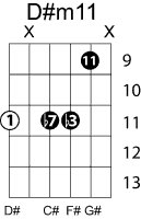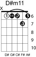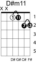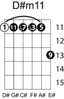 | Symbol: D#m11 Alt. symbol: D#-11, D#min11 Name: D sharp minor nine eleventh | ![]() | D-1 | C-6 | A-6 | G-11 |