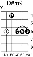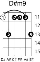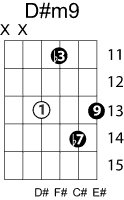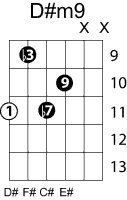 | Symbol: D#m9 Alt. symbol: D#min9, D#-9 Name: D sharp minor ninth | ![]() | C-6 | G-11 | E-11 | E-13 |