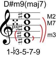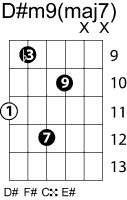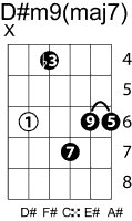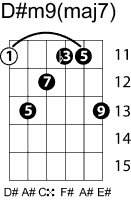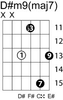 | Symbol: D#m9(maj7) Alt. symbol: D#m9+7, D#-9+7 Name: D sharp minor ninth, major seventh | ![]() | C-6 | G-11 | E-11 | E-13 |