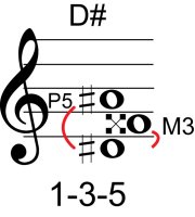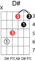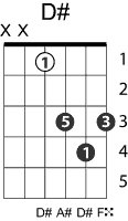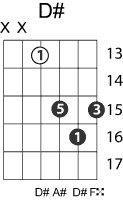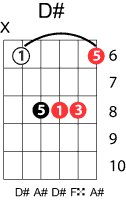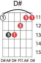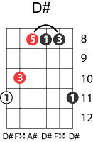 | Symbol: D# Alt. symbol: D#maj, D#M Name: D sharp major | ![]() | D-1 | C-6 | A-6 | G-11 |