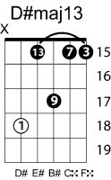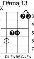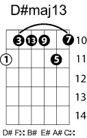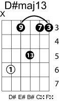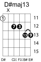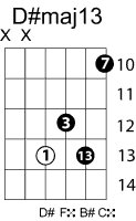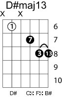 | Symbol: D#maj13 Alt. symbol: D#M13 Name: D sharp major thirteen | ![]() | C-6 | C-6 | A-6 | G-11 |