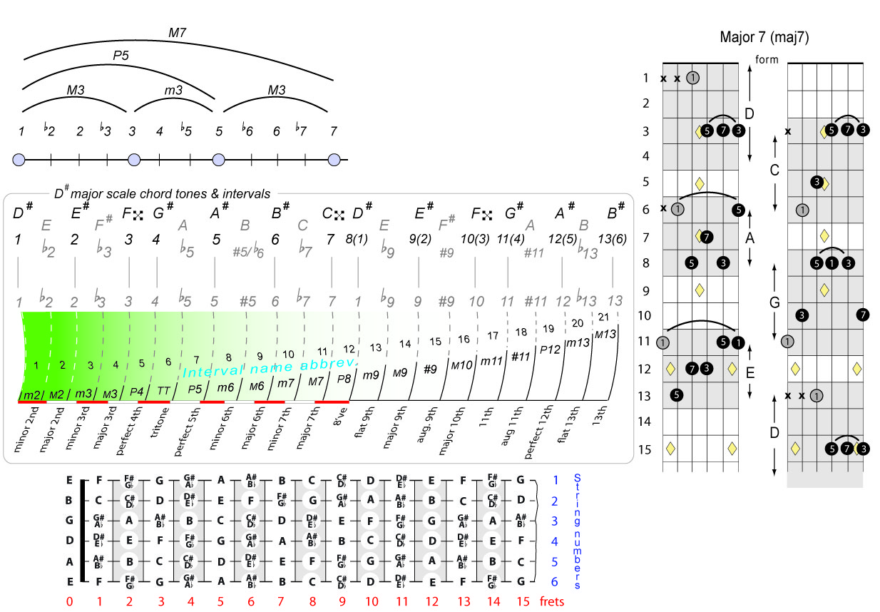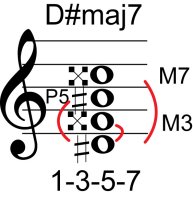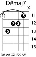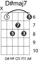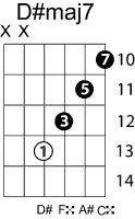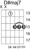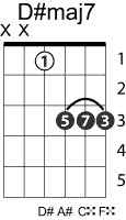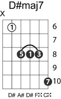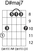| Symbol: D#maj7 Alt. symbol: D#M7 Name: D sharp major seventh | ![]() | D-1 | C-6 | A-6 | A-6 |
