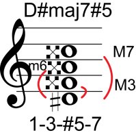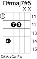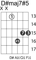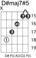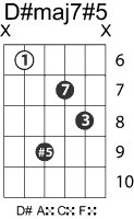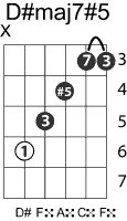 | Symbol: D#maj7#5 Alt. symbol: Name: D sharp major seventh sharp fifth | ![]() | D-1 | C-6 | A-6 | E-13 |