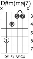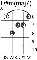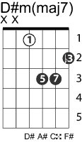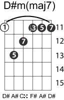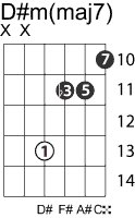 | Symbol: D#m(maj7) Alt. symbol: D#m(+7) Name: D sharp minor major seventh | ![]() | D-1 | C-6 | A-6 | E-13 |