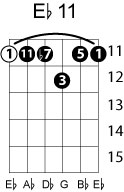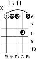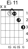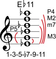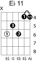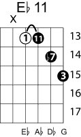 | Symbol: E♭11 Alt. symbol: Name: E flat eleventh | ![]() | D-1 | C-6 | A-6 | E-11 |