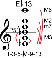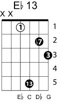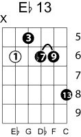 | Symbol: E♭13 Alt. symbol: E♭dom13 Name: E flat thirteenth | ![]() | D-1 | A-6 | G-11 | E-11 |