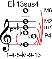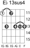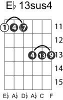 | Symbol: E♭13sus4 Alt. symbol: E♭13sus Name: E flat thirteenth, suspended fourth | ![]() | A-6 | E-11 | E-11 |