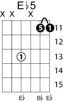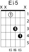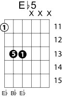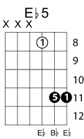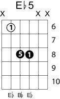 | Symbol: E♭5 Alt. symbol: E♭ no 3rd Name: E flat fifth (power chord) | ![]() | D-1 | A-6 | G-11 | -8 |