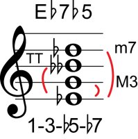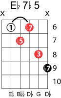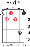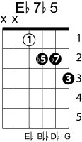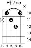 | Symbol: E♭7♭5 Alt. symbol: E♭7-5, E♭dom7♭5 Name: E flat dominant seventh, flat fifth | ![]() | D-1 | A-6 | G-11 | E-11 |