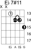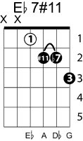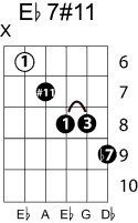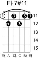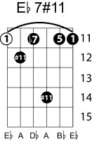 | Symbol: E♭7#11 Alt. symbol: E♭7+11, E♭dom7#11 Name: E flat dominant seventh, sharp eleventh | ![]() | D-1 | A-6 | A-6 | A-6 |