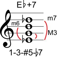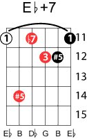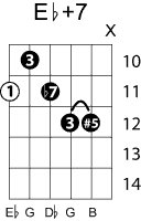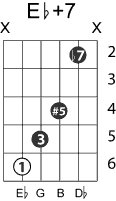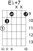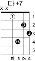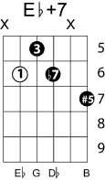 | Symbol: E♭+7 Alt. symbol: E♭7#5 Name: E flat seventh, sharp fifth | ![]() | D-1 | C-6 | A-6 | A-6 |