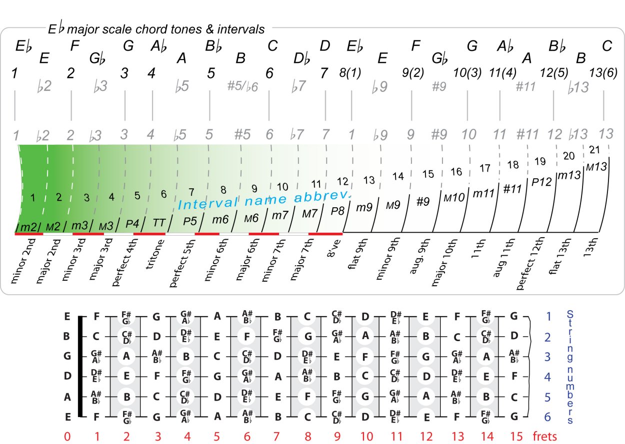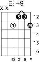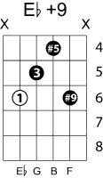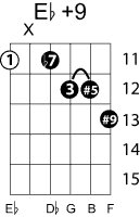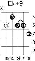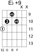 | Symbol: E♭+9 Alt. symbol: E♭9#5, E♭9+5, E♭+9 Name: E flat ninth, sharp fifth | ![]() | C-6 | C-6 | G-11 | G-11 |