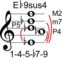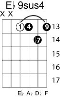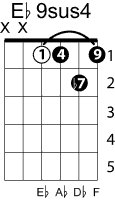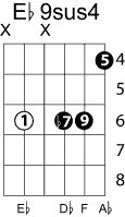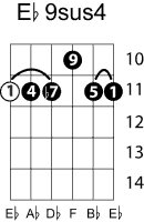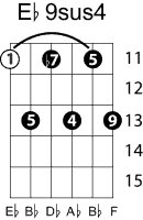 | Symbol: E♭9sus4 Alt. symbol: E♭9sus Name: E flat ninth, suspended fourth | ![]() | D-1 | C-6 | C-6 | G-11 |