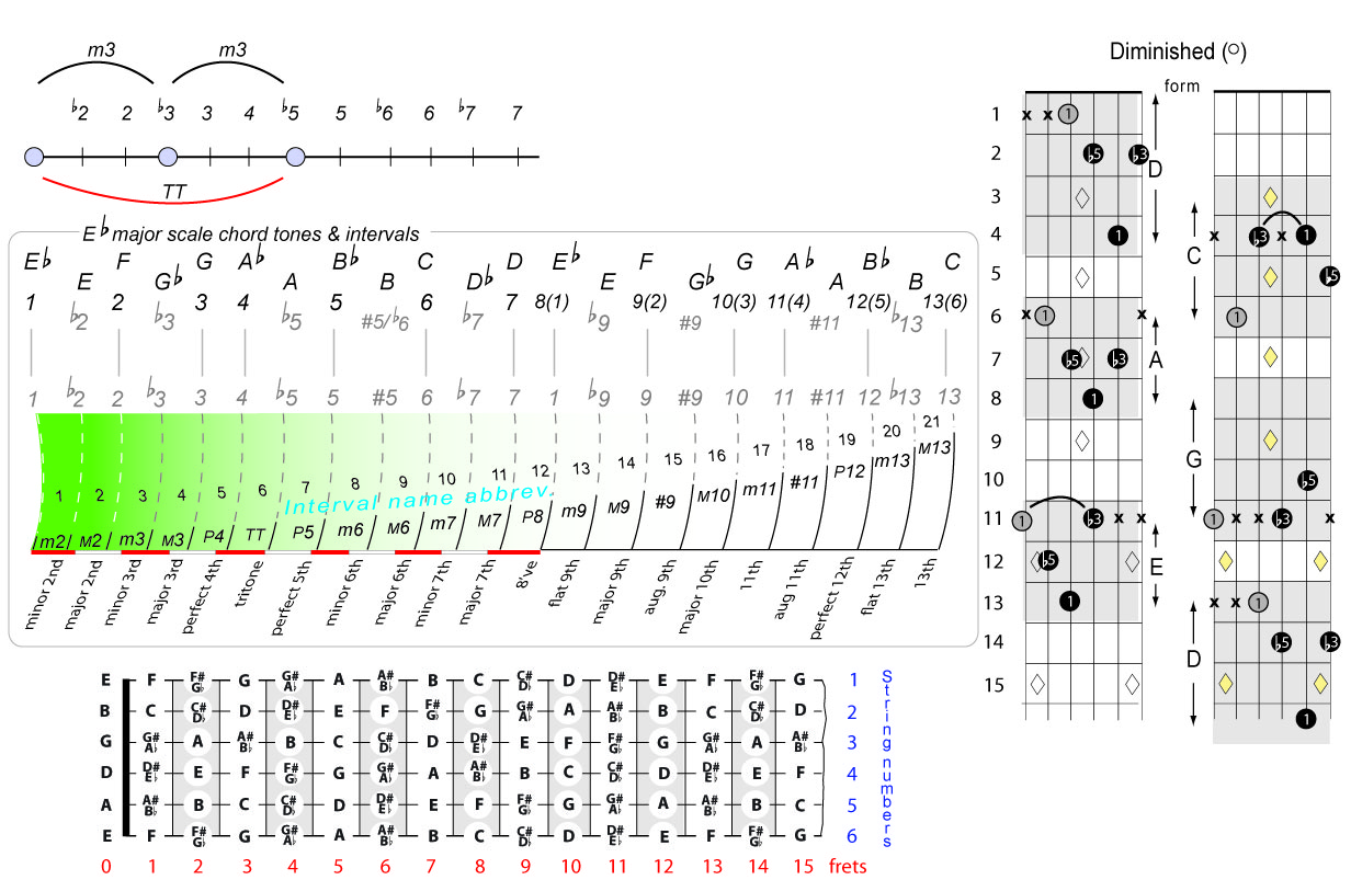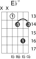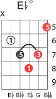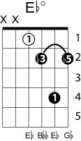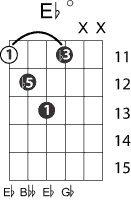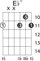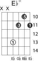| Symbol: E♭° Alt. symbol: E♭dim Name: E flat diminished | ![]() | D-1 | C-6 | A-6 | G-11 |