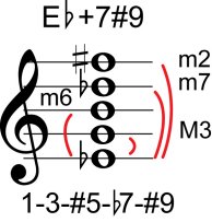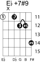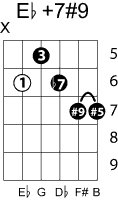 | Symbol: E♭+7#9 Alt. symbol: E♭7+5(#9) Name: E flat dominant seventh, sharp fifth, sharp ninth | ![]() | A-6 | E-11 |