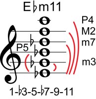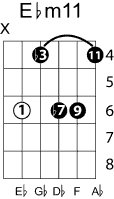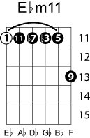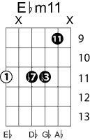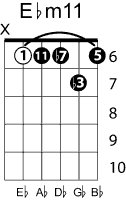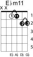 | Symbol: E♭m11 Alt. symbol: E♭-11, E♭min11 Name: E flat minor nine eleventh | ![]() | D-1 | C-6 | A-6 | G-11 |