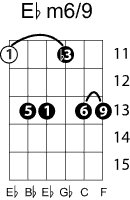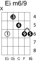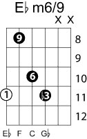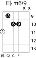 | Symbol: E♭m6/9 Alt. symbol: Name: E flat minor sixth, added ninth | ![]() | C-6 | G-11 | G-11 | E-11 |