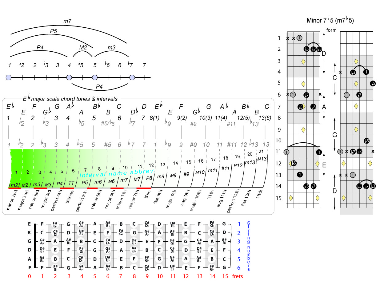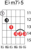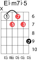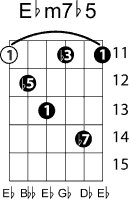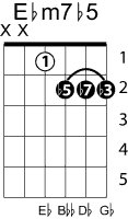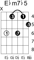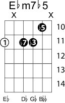 | Symbol: E♭m7♭5 Alt. symbol: E♭-7(♭5), E♭min7-5, half-dim. Name: E flat minor seventh, flat fifth | ![]() | D-1 | C-6 | A-6 | G-11 |