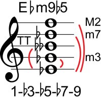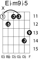 | Symbol: E♭m9♭5 Alt. symbol: E♭m9-5, E♭min9♭5 Name: E flat minor ninth, flat fifth | ![]() | C-6 | E-11 |