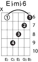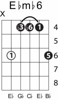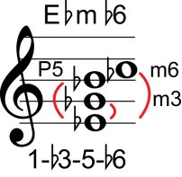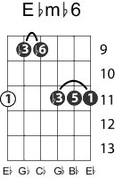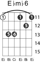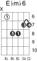 | Symbol: E♭m♭6 Alt. symbol: E♭-(♭6), E♭min♭6 Name: E flat minor, flat sixth | ![]() | D-1 | D-1 | C-6 | A-6 |