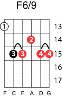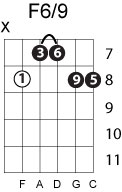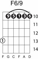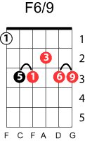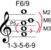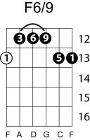 | Symbol: F6/9 Alt. symbol: F6add9 Name: F sixth, added ninth | ![]() | G-1 | E-1 | C-8 | G-13 |
