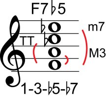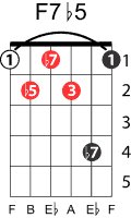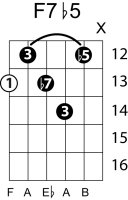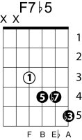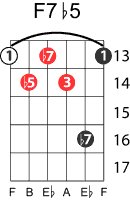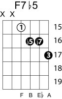 | Symbol: F7♭5 Alt. symbol: F7-5, Fdom7♭5 Name: F dominant seventh, flat fifth | ![]() | E-1 | D-3 | A-8 | G-13 |