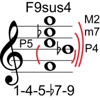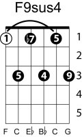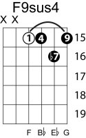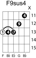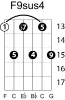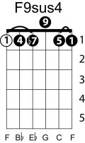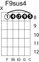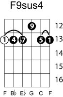 | Symbol: F9sus4 Alt. symbol: F9sus Name: F ninth, suspended fourth | ![]() | E-1 | G-1 | D-3 | C-8 |