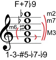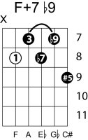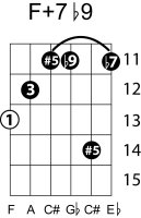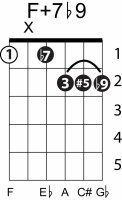 | Symbol: F+7♭9 Alt. symbol: F7+5(♭9) Name: F dominant seventh, sharp fifth, flat nine | ![]() | E-1 | C-8 | G-13 |
