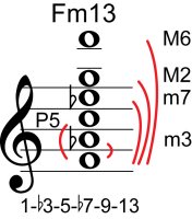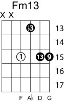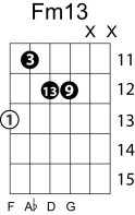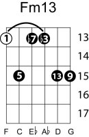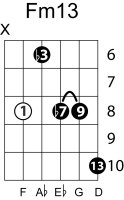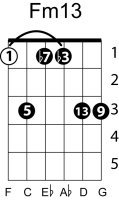 | Symbol: Fm13 Alt. symbol: F-13, Fmin13 Name: F minor thirteenth | ![]() | E-1 | A-8 | G-3 | E-13 |