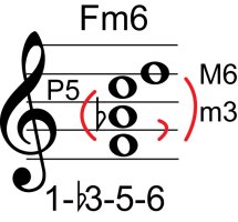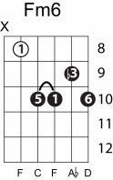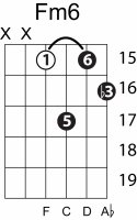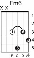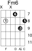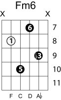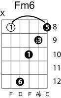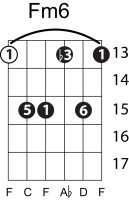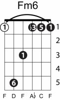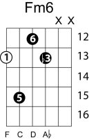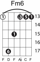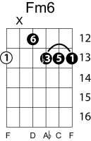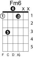 | Symbol: Fm6 Alt. symbol: Fmin6, F-6 Name: F minor sixth | ![]() | E-1 | E-1 | E-1 | D-3 | |