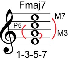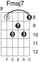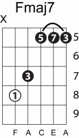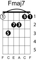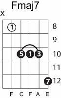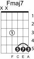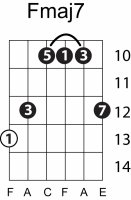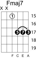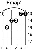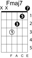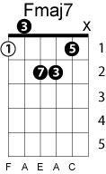 | Symbol: Fmaj7 Alt. symbol: FM7 Name: F major seventh | ![]() | E-3 | E-1 | E-1 | D-3 | |