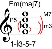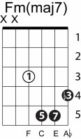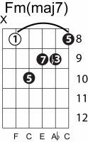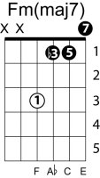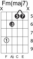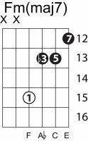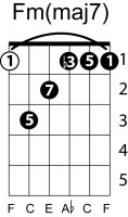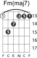 | Symbol: Fm(maj7) Alt. symbol: Fm(+7) Name: F minor major seventh | ![]() | E-3 | E-1 | D-3 | C-8 |
