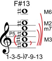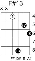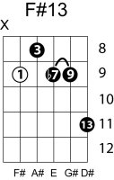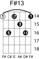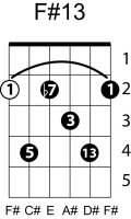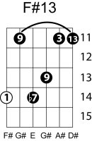 | Symbol: F#13 Alt. symbol: F#dom13 Name: F sharp thirteenth | ![]() | E-2 | D-4 | A-9 | G-14 |